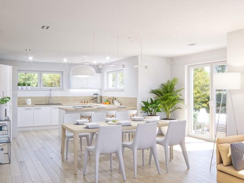 Dieses Einfamilienhaus mit einem 2,25 m hohen Kniestock bietet viel Platz und fast keine Dachschrägen in der oberen Etage. Die Variante mit „drittem Giebel in Flachdachoptik“ erweitert auf sinnvolle Weise den Essbereich im Erdgeschoss und vergrößert gleichermaßen das Gästezimmer im Dachgeschoss um weitere vier Quadratmeter. Somit können im Dachgeschoss sogar drei, nahezu gleich große, Kinderzimmer untergebracht werden. Ebenfalls in der oberen Etage befindet sich das Elternschlafzimmer und das moderne Familienbad mit modernem Zuschnitt.